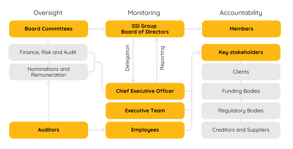 The governance structure illustrates how the SSI Group (except for SSI Legal Pty Ltd, which is governed separately) is directed, controlled and held accountable to its members and key stakeholders. The workflow set out in the figure brings together all the different governance components within the SSI Group.