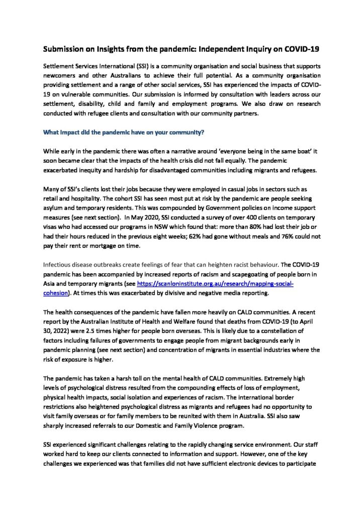 Submission on Insights from the pandemic: Independent Inquiry on COVID-19